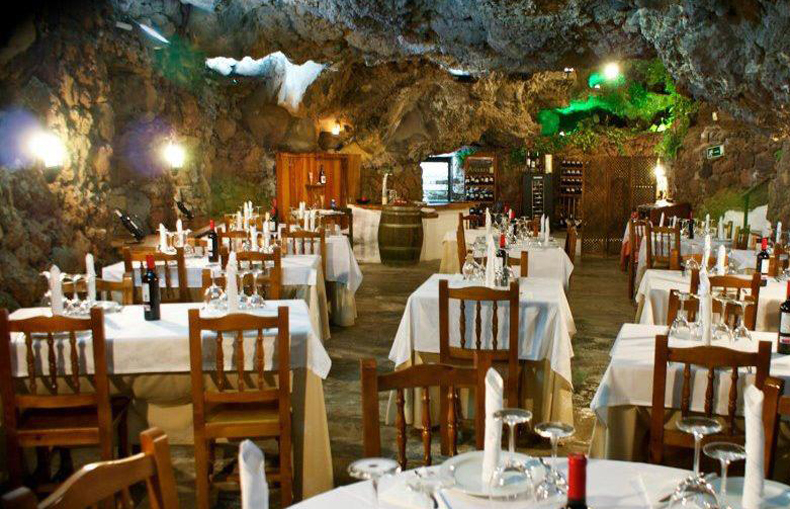 Restaurante decorado con roca volcánica.
